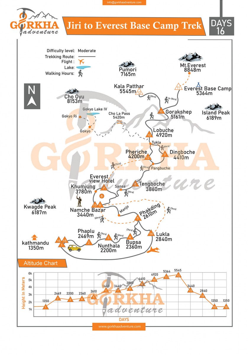 The Everest base camp trekking trail is a beautiful and popular trekking and hiking trail among most famous trekking routes in Nepal. Mainly Everest base camp trek is start from Lukla or Jiri Bazzar. our given below Everest base camp trekking outline itinerary is start from Jiri, which is oldest trekking route to approach the Everest base camp (5364m) and Kala Pattar (5545m). The trek from Jiri involves a tremendous amount of up and down walking and insight into local culture and traditional way of lives unchanged from century. the first day trek from Jiri bus stop takes a long climb-up to Bhandar leads you to a completely Sherpa country exception of Jubing. Crossing the top of the Lamajura Bhanjyang (3530m) and into the moist mountain forest of rhododendrons, magnolia maple and brich home too many species of colorful bird; you will pass several ridge meandering among green hill viewing some snow peaks on the way up.