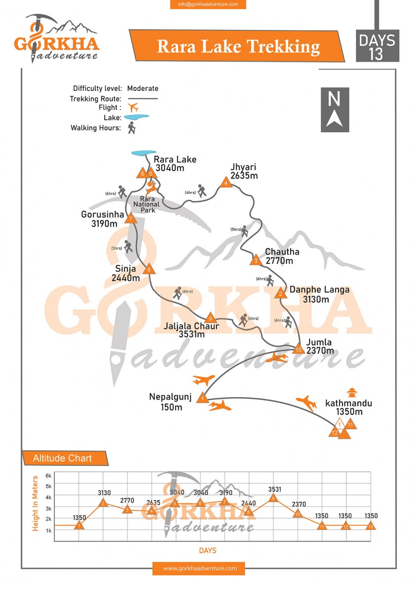 Rara lake trekking trip begins with flight from Kathmandu to Nepalgunj continue fly to Jumla and walking along with landscape three - four days reach around Rara Lake and Rara national park side and explore around and return back from same route to Jumla and fly back to Pokhara or Nepalgunj and subsequently to Kathmandu. https://www.immigration.gov.np/page/trekking-route